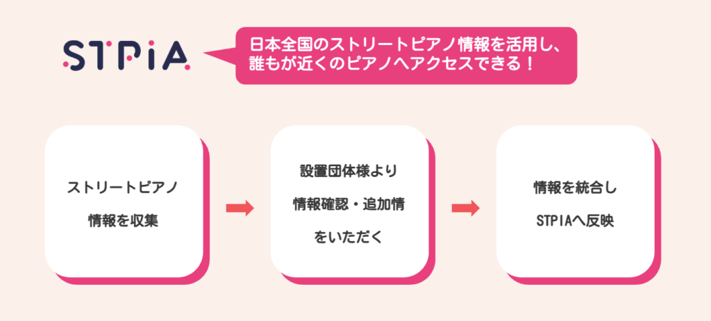 その想いから、日本全国のストリートピアノ情報を体系的に可視化し、正確で最新のストピ情報を発信するプラットフォームとして、STPIA(ストピア)を立ち上げました。